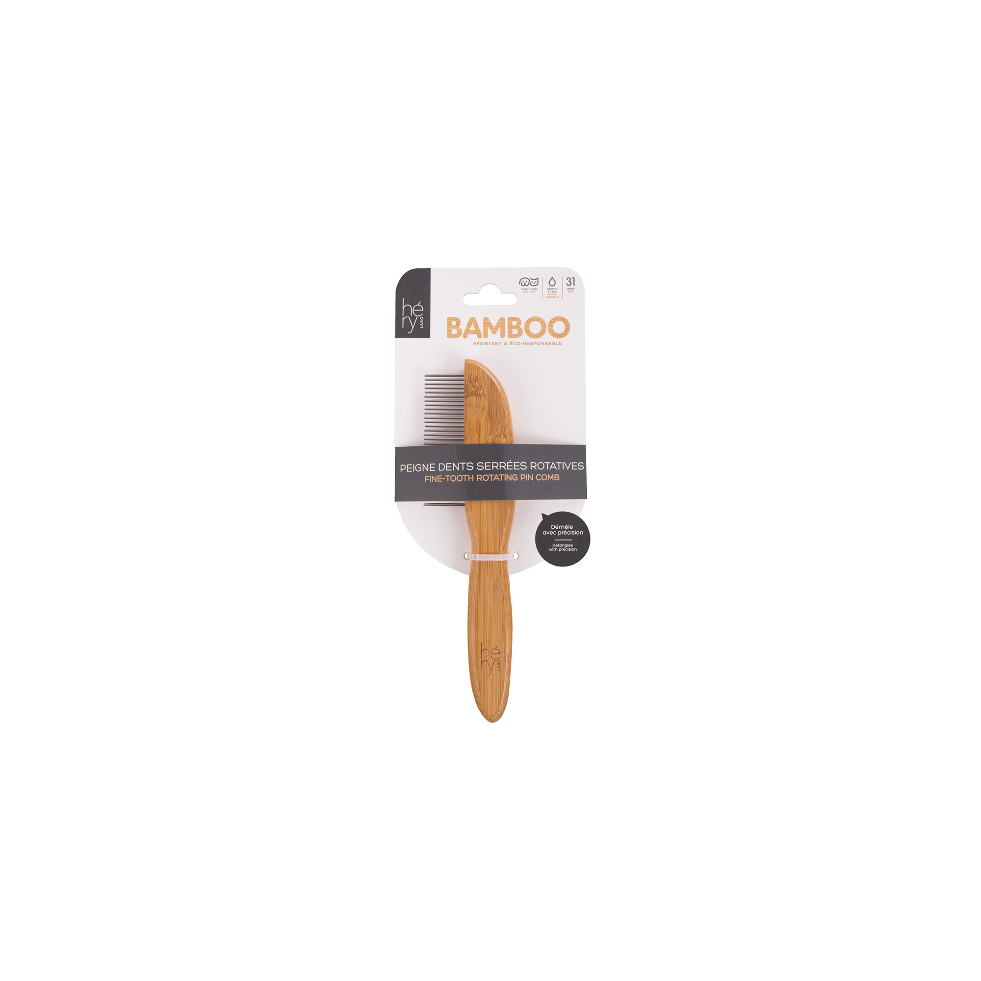 Ce peigne pour chien et chat est fait d'un manche en bambou et de dents Tournantes.