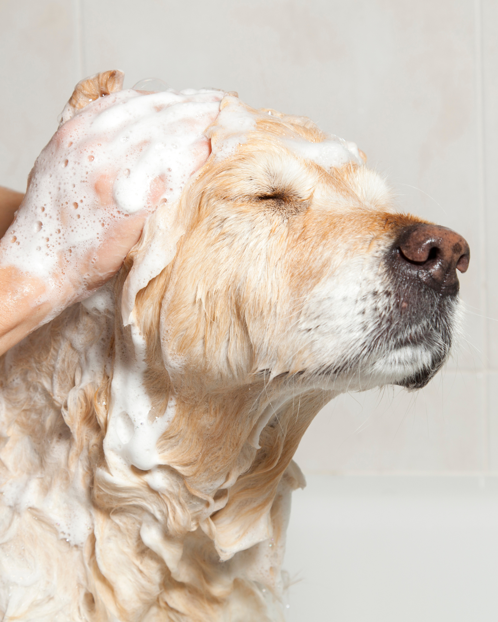 Bain avec le shampoing répulsif à la menthe de la marque IV SAN BERNARD, respectueux du pH de la peau et adapté à tous types de poils. Le soin contribue à protéger le pelage tout en apportant une sensation de fraîcheur.