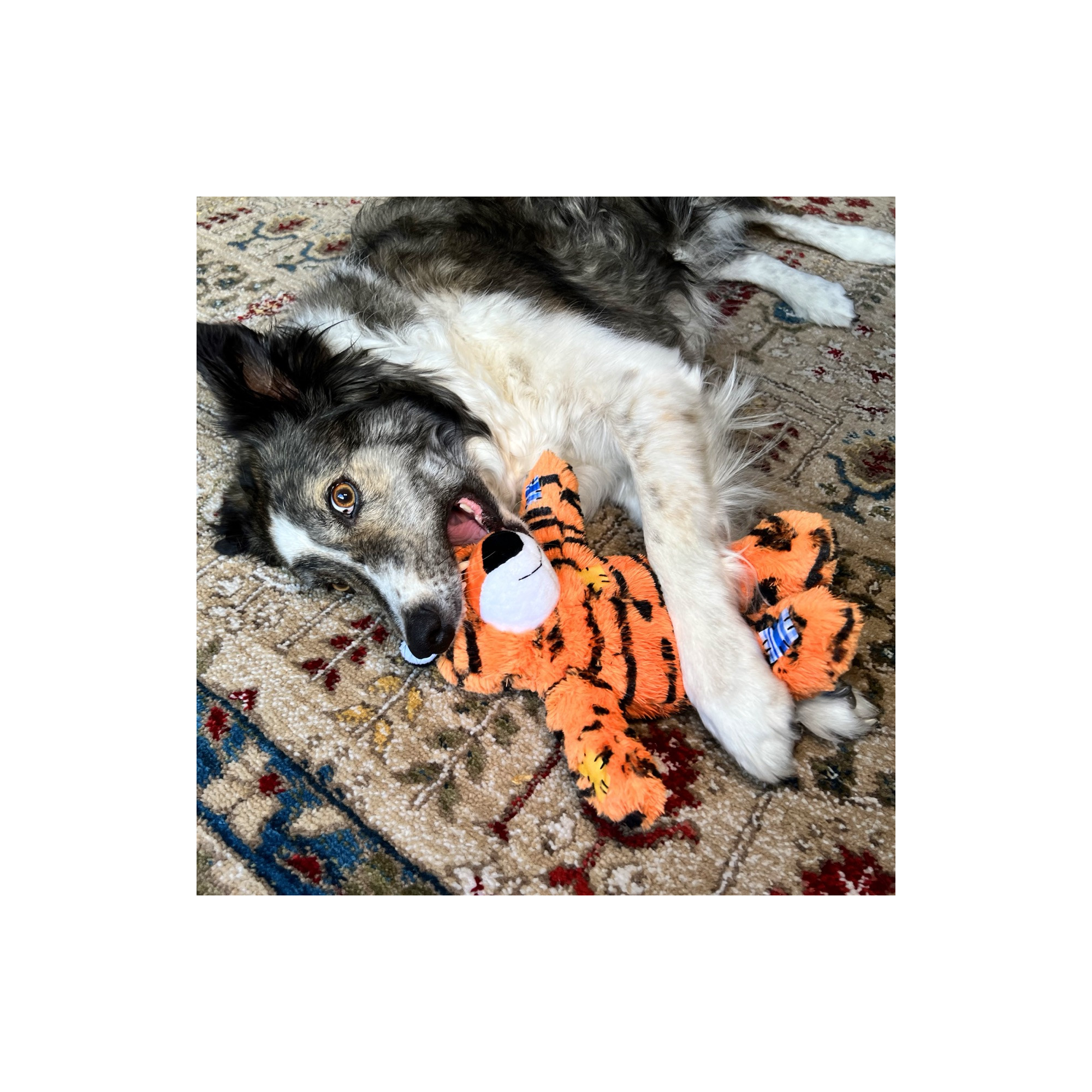Le jouet KONG Wild Knots Tigre est doux et réconfortant à l'extérieur, mais solide et résistant à l'intérieur grâce à son squelette en corde qui satisfait les instincts naturels du chien. Ses couinements et ses crépitements prolongent le safari, et son rembourrage minime limite les dégâts. Son corps en peluche est parfait pour les câlins dans la savane, ou sur le canapé.